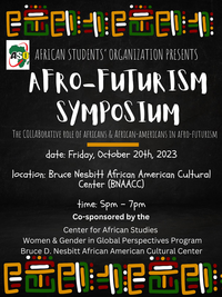 African Students' Organization presents AFRO-FUTURISM SYMPOSIUM. Collaborative Role of Africans & African-Americans in Afro-Futurism. Co-sponsored by: Center for African Studies, Bruce D. Nesbitt African American Cultural Center, Women and Gender in Global Perspectives Program