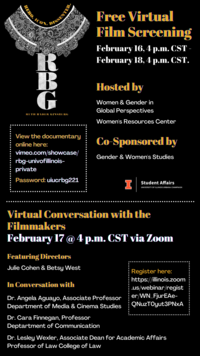 4:00 pm 2/17/2021On Wednesday, February 17th at 4 p.m. CST, there will be a virtual conversation with RBG film directors, Julie Cohen and Betsy West. This is event is hosted by Women & Gender in Global Perspectives and the Women’s Resources Center and is co-sponsored by Gender & Women’s Studies. Please share widely, and we hope to see you there!