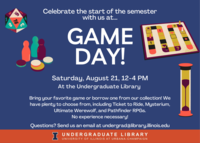 12:00 - 4:00 pm 8/21/2021Undergraduate Library, 1402 W. Gregory Drive, UrbanaOn Saturday, August 21st, celebrate the start of the semester at the UGL with games like Codenames, Splendor, Pathfinder, and Ticket to Ride!