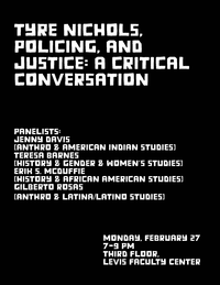 7:00 - 9:00 pm 2/27/2023Levis Faculty Center, Room 300Panelists: Jenny Davis (Anthropology and American Indian Studies), Teresa Barnes (History and Gender & Women's Studies), Erik S. McDuffie (History and African American Studies), and Gilberto Rosas (Anthropology and Latina/Latino Studies).