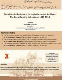 10:00 am - 5:00 pm 4/23/2025International and Area Studies LibraryJoin us for an event exploring the Jesuit archives at the Jesuit University in Beirut. The archive includes memoirs, diaries, letters, and other documents that detail various aspects of daily life during The Great Famine from 1915 to 1918. Featured speakers include Dr. Christian Taoutel (Saint Joseph University of Beirut) and Dr. Marc Abou Abdallah (Uof I)
