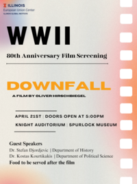 5:30 pm 4/21/2025Knight Auditorium, Spurlock Museum, 600 S Gregory St, Urbana, IL 61801Please join the EUC, History, and Political Science for a screening of the 2004 film Downfall (Der Untergang), which depicts the final days of Adolf Hitler during the Battle of Berlin.