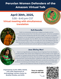 5:30 - 6:45 pm 4/30/2025Join us for a powerful conversation with Peruvian women environmental defenders as they share firsthand experiences from the frontlines of climate activism in the Amazon. Learn about the challenges they face, the communities they protect, and the urgent realities of defending land, water, and life in one of the world’s most threatened ecosystems.