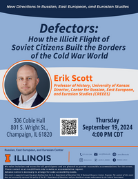 4:00 pm 9/19/2024306 Coble Hall (801 S. Wright St.)Join Erik Scott for a discussion of his recent book, "Defectors: How the Illicit Flight of Soviet Citizens Built the Borders of the Cold War World." This groundbreaking book, recently published by Oxford University Press, explores how defectors, pursued by their home states and coveted by the U.S. and allies, influenced global borders and intelligence rivalries.
