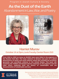5:00 pm 10/14/2024Levis Faculty Center, Room 210From 1918 to 1922 as many as 40,000 Jews were killed in the pogroms of the Russian Civil War. The mass violence in Ukraine was part of a global phenomenon of ethnic and racial violence, which also included the Armenian genocide. This book talk examines the Yiddish and Russian literary response to the pogroms and the relief effort, exploring both the poetry of...