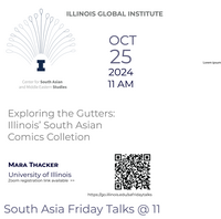 11:00 am - 12:00 pm 10/25/2024Exploring the Gutters: Illinois’ South Asian Comics Collection This talk by Mara Thacker, South Asian Studies & Global Popular Culture Librarian, will look into the history and evolution of the South Asian comics collection situated within the context of comics production and circulation in South Asia and showcase samples