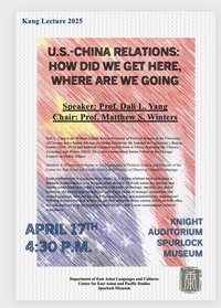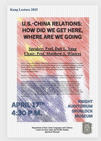 4:30 - 5:45 pm 4/17/2025Knight Auditorium, Spurlock MuseumKang Endowed Lecture with Professor Dali Yang (Univ. of Chicago) traces the dramatic transformation of U.S.-China relations over the past seven decades, from confrontation to engagement to rivalry. It focuses on key patterns and turning points leading to current tensions over trade, technology, security, and global influence, and explores future prospects.