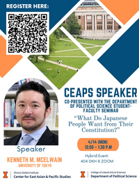 12:00 - 1:30 pm 4/14/2025404 David Kinley HallThe Constitution of Japan, the oldest unamended constitution in the world, has become the focus of renewed partisan debate, with government leaders increasingly advocating for revision. However, whether this elite-driven initiative aligns with public sentiment remains uncertain.