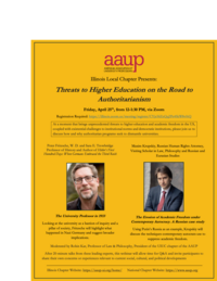12:00 - 1:30 pm 4/25/2025At a moment that brings unprecedented threats to higher education and academic freedom 10 the US, coupled with existential challenges to institutions norms and democratic institutions, please join the AAUP Illinois Local Chapter to discuss how and why authoritarian programs seek to dismantle universities.