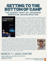 5:00 pm 3/11/2025AAS Conference Room; 1208 W Nevada St, Urbana, ILElaborating on camp as a cultural strategy for contesting accounts of Asian American history that overly rely on terms of abjection, Chris Eng reassesses narratives that construe the Japanese American incarceration as an experience of hitting the bottom, a violation akin to sodomy.