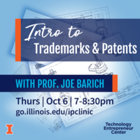 7:00 - 8:30 pm 10/6/2022Altgeld Hall Room 314, University of Illinois Urbana-ChampaignOct. 6 | Altgeld Hall Room 314 | 7-8:30 pm | Have a brilliant idea and not sure about protecting intellectual property? Come listen to Prof. Joe Barich, a licensed patent attorney and an Adjunct Professor in the College of Law. He will share valuable insights about protecting your startup idea and answer your questions about patents and trademarks.