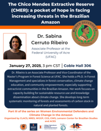 3:00 pm 1/27/2025306 Coble Hall, 801 S Wright StreetThe Chico Mendes Extractive Reserve (CMER): a pocket of hope in facing increasing threats in the Brazilian Amazon by Dr. Sabina Cerruto Ribeiro January 27, 2025 | 3 pm CTS | 306 Coble Hall, 801 S Wright St