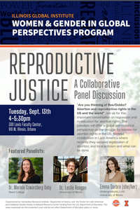 4:00 - 5:30 pm 9/13/2022300 Levis Faculty Center, 919 W. Illinois, Urbana“Are you thinking of Roe/Dobbs? Abortion and reproductive rights in the US and the world” Join us for this important conversation on regression and mobilization for abortion rights. The panelists will offer a global and historical perspective on the struggle by women for abortion rights in the US; feminist mobilization in Latin America; and local activism efforts.