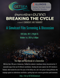 5:00 pm 10/1/2024108 Coble Hall (801 S. Wright Street)Breaking the Cycle captures the political awakening among Thais after the rise and fall of Thanathorn, a young politician who calls to end the cycle of coups d’etat. The film explores the 2029 election in Thailand, which marked the end of five years of full military rule and a new group of young politicians who campaign against an authoritarian constitution...