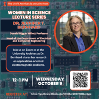 12:00 - 1:00 pm 10/9/2024Join us on Zoom (registration link below) or at the University Archives (146 Main Library, 1408 W. Gregory Drive, Urbana)Department Head and Donald Biggar Willett Professor in Electrical and Computer Engineering, Dr. Bernhard will discuss her research on applications-oriented electromagnetic problems with an emphasis on theoretical analysis and experimental investigation.