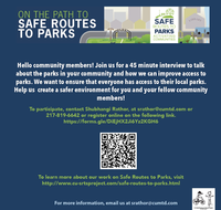 All Day 1/14/2021 - 3/26/2021Hello community members! Join us for a 45 minute interview to talk about the parks in your community and how we can improve access to parks. We want to ensure that everyone has access to their local parks. Help us create a safer environment for you and your fellow community members!