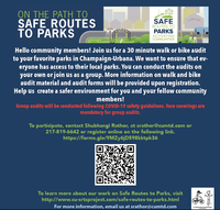 All Day 1/14/2021 - 3/26/2021Hello community members! Join us for a 30 minute walk or bike audit to your favorite parks in Champaign-Urbana. We want to ensure that everyone has access to their local parks. You can conduct the audits on your own or join us as a group. More information on walk and bike audit material and audit forms will be provided upon registration. Help us create a safer environment.