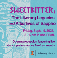 3:00 - 5:00 pm 9/19/2025Main Library Room 346Join us for the opening reception of RBML's fall exhibit, "Sweetbitter: The Literary Legacies and Afterlives of Sappho", featuring poetry and dance performances.