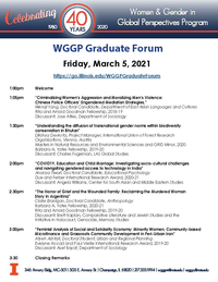 1:00 - 4:00 pm 3/5/2021WGGP Graduate Forum will bring together WGGP Fellowship and Award Recipients to discuss their research projects. The forum will take place on Friday, March 5, 2021 from 1:00-4:00pm.