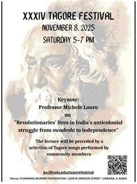 5:00 - 7:00 pm 11/8/2025Channing Murray Foundation, 1209 W Oregon St Urbana, IL 61801The Annual Tagore Festival commemorates the Nobel Laureate’s visit to the UIUC campus in 1912 when he delivered a series of lectures at the Channing Murray Chapel, the first Unitarian Church of Urbana.
