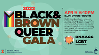 6:00 - 10:00 pm 4/9/2022Illini Union I-RoomsBlack and Brown Queer Gala is a social event for Urbana-Champaign LGBGTQ, offering a space to meet and connect. Come sing, dance, perform, and network. Celebrate Black and Brown pride and excellence in the community.
