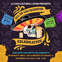 6:00 - 8:00 pm 11/1/2023University YMCA, 1001 S. Wright St, ChampaignDía de los Muertos, also known as Day of the Dead, is a Latin American holiday where families welcome the souls of their deceased loved ones. Although this holiday is thought to be a sad holiday, it is not! Dia de los Muertos is about celebration and to be reminded of the moments we shared with those who have passed.