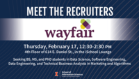 12:30 - 2:30 pm 2/17/2022BS, MS, and PhD Students Meet us in the iSchool Lounge on the 4th floor of 614 E. Daniel to chat with Wayfair's data and software engineers, as well as one of our recruiters after our visit to IS 199 at the iSchool to learn more about our opportunities, culture, and open roles! We have openings in Data Science, Software Engineering, Data Engineering, and Technical busi