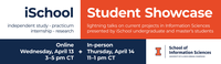 11:00 am - 1:00 pm 4/14/2022iSchool building, 4th floor (614 E. Daniel St.) more details to come.The showcase is a great opportunity to champion your accomplishments. Specific benefits include: Gain experience translating complex concepts to a wide audience Present in a formal yet comfortable conference style Practice communicating your value, skills, and strengths Network with students, faculty, and staff Add to your resume/CV