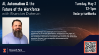 12:00 - 1:00 pm 5/2/2023EnterpriseWorks, 60 Hazelwood DriveJoin us on Tuesday, May 2 from 12-1 pm for a workshop on "AI, Automation & The Future of the Workforce" with Brandon Dohman.