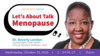 2:00 - 3:00 pm 10/25/2023Women@NCSA invites you to an exciting discussion about menopause featuring esteemed guest speaker Dr. Beverly London, a gynecologist at Carle Health, on Wednesday, Oct. 25, from 2–3 p.m. CST on Zoom. Dr. London will share menopause information pearls and discuss how you can support your partners, colleagues, friends, and family members throughout their menopause journeys.