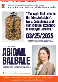 4:00 pm 3/25/20251080 LCL - Lucy Ellie Lounge & Conference Center, 707 Mathew Ave, Urbana, IL 61801Associate Professor in the Department of Middle Eastern and Islamic Studies at New York University, Abigail Balbale, is being hosted by UIUC Program in Medieval Studies and School of Architecture on March 25, 2025.