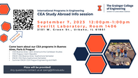 12:00 - 1:00 pm 9/7/2023Everitt Laboratory, Room 1406Come learn about our CEA programs in Buenos Aires, Paris & Prague! • CEA Buenos Aires- Latin America & the Caribbean Studies • CEA Prague, Czech Republic • ENGR: CEA Buenos Aires- Sophomore Semester • ENGR: CEA Paris-Sophomore Semester • Summer ENGR: CEA Prague Engineering and Math