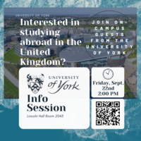 2:00 pm 9/22/2023Lincoln Hall 2043Join LAS International Programs and our guests from the University of York as we explore our unique program. From student life abroad, academics, and opportunities on campus, you won't want to miss this opportunity to learn more.