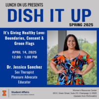 12:00 - 1:00 pm 4/14/2025Women's Resources Center - 616 E Green St, Suite #213, Champaign IL 61820Join us for our Dish It Up/Lunch on Us Series at the Women's Resources Center every 2nd & 4th Monday at noon (12 p.m. CST), while listening to speakers, lecturers, and panelists explore a variety of topics at the intersection of gender and other social identities.