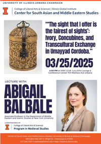 4:00 pm 3/25/20251080 LCLB- Lucy Ellis Lounge & Conference Center 707 Mathew Ave UrbanaAbstract: Of the many beautiful objects associated with Madinat al-Zahra and the Cordoban Umayyad caliphate, perhaps none are as celebrated as a series of ivory pyxides and caskets produced for members of the royal family. Several of them were made for royal mothers, formerly enslaved concubines who earned their freedom by bearing the caliph's children. Caliphal concubines