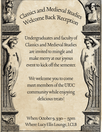 3:30 - 5:00 pm 10/9/2025Lucy Ellis Lounge -- room 1080, Literatures, Cultures, and Linguistics BuildingUndergraduates and faculty in Classics and Medieval Studies are invited to mingle and make merry at this kick-off event!