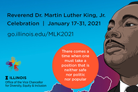 3:00 pm 1/17/2021The Annual County-wide Celebration commemorates Dr. King’s legacy by bringing together community members from Champaign County to celebrate the mission, teachings, and legacy of Dr. King. This year’s keynote speaker, the Rev. Dr. William J. Barber II, is the President & Senior Lecturer of Repairers of the Breach, Co-Chair of the Poor People’s Campaign.