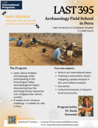 1:00 pm 1/19/2024Lincoln Hall 2043Are you interested in getting hands on archeological experience in an innovative and original research site? Join LAS International Programs and Professor Kasia Szremski to learn more about LAS 395: Archeology Field School in Peru. If you have any questions, please contact Victoria Prince (vprince2@illinois.edu).