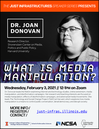 12:00 - 1:00 pm 2/3/2021Just Infrastructures announces its inaugural Speaker Series with Joan Donovan, Research Director of the Shorenstein Center on Media, Politics, and Public Policy at Harvard University, presenting “What is Media Manipulation?” on Feb. 3, 2021. The event is on Zoom from 12-1p.m. central time.