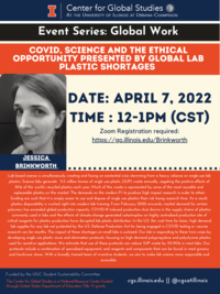 12:00 - 1:00 pm 4/7/2022On April 7, 2022 at 12pm (CST) on Zoom, Prof. Jessica Brinkworth (UIUC Anthropology) will give a talk exploring the impact of the COVID-19 Pandemic and labratory work's reliance on single-use plastics.
