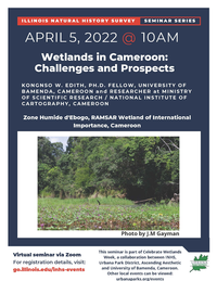 10:00 am 4/5/2022This presentation is part of a collaboration between the Wetland Science Program at the Illinois Natural History Survey, the Urbana Park District, Ascending Aesthetic, and the University of Bamenda, Cameroon, for “Celebrate Wetlands Week” with events during April 3-9, 2022.