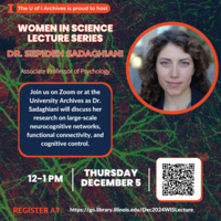 12:00 - 1:00 pm 12/5/2024Join us on Zoom (registration link below) or at the University Archives (146 Main Library, 1408 W. Gregory Drive, Urbana)Associate Professor of Psychology, Dr. Sadaghiani will discuss her research on large-scale neurocognitive networks, functional connectivity, and cognitive control.